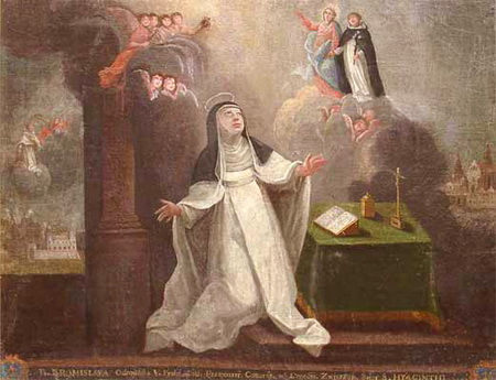 Błogosławiona Bronisława patronka Śląska Opolskiego (Tytuł błogosławionej Bronisławy z litanii pielgrzymstwa narodu polskiego)  W roku 1203 w miejscowości Kamień Śląski, nad którą góruje wspaniały zamek, należący w tym czasie do słynnego rodu Odrowążów, w bardzo bogobojnym małżeństwie Stanisława Odrowąża, (zwanego również Miłosławem; dziadek błogosławionej Bronisławy nazywał się Paweł II Odrowąż i miał on na pewno przynajmniej jedną córkę, Gertrudę przyszłą Ksienię klasztoru norbertanek w Ibramowicach1, oraz czterech synów: Eustachego - ojca świętego Jacka, Iwona - późniejszego biskupa krakowskiego, Miłosława - ojca naszej błogosławionej oraz Iwana. Krewnym Bronisławy miał być też błogosławiony Czesław2) i Anny z domu Gryf, (wnuczki Jaksy Gryfity z Miechowa, który był fundatorem klasztoru norbertanek u stóp wzgórza Salwatora na krakowskim Zwierzyńcu.) przyszła na świat dziewczynka, której na imię dano Bronisława. Była ich pierwszym dzieckiem (później Odrowążowie mieli jeszcze dwóch młodszych synów, Szczęsława i Mikułę), a więc bardzo kochanym. Od młodości już wykazywała się wielką pobożnością, ochoczo uczestnicząc w kaplicy zamkowej wraz ze swoimi rodzicami w modlitwach porannych i wieczornych oraz w Mszach świętych. Mama nauczyła również Bronisławę uprawy i przyrządzania oraz stosowania ziół leczniczych, które sadzono w zamkowym wirydarzu, czyli ogródku. Chodziła potem, razem z mamą bądź sama, z tymi ziołami do chorych mieszkańców swojego grodu, przynosząc im lekarstwa i pożywienie, łagodząc ich bóle oraz lecząc ich różne dolegliwości. Rozdawała również jałmużnę ubogim, ciesząc się bardzo z tego obowiązku. Uwielbiała wieczorami słuchać opowiadań mamy o Męce Pańskiej, płacząc obficie nad cierpieniami Pana Jezusa. Lubiła też, mimo swojego wysokiego rodu, wchodzić do izby czeladnej, gdzie razem z dziewczętami wiejskimi, przędła len i konopie albo opowiadała im zasłyszane od matki czy swojego księdza kapelana historie biblijne, a najchętniej oczywiście przykłady z życia Pana Jezusa. Raz, usłyszawszy od pewnego pielgrzyma z Krakowa o cudach, które zdarzały się w katedrze na Wawelu, gdzie u grobu świętego męczennika biskupa Stanisława widziano tego świętego, jak Mszę świętą celebruje, jak procesji wśród aniołów i świętych przewodzi i jak błogosławieństwo biskupie przekazuje, a wszystko to wśród dźwięku dzwonów, które bez ludzkiej pomocy cały czas dzwoniły, postanowiła wtedy nasza młoda święta wziąć sobie za swojego patrona świętego męczennika Stanisława. Kiedy błogosławiony biskup krakowski Wincenty Kadłubek w roku 1218 złożył swą godność, postanowiwszy resztę życia spędzić na modlitwie i pokucie w klasztorze Ojców Cystersów, kapituła krakowska wybrała na jego następcę Iwona Odrowąża, kanclerza Leszka Białego. Był to brat rodzony Stanisława, pana na Kamieniu Śląskim, a więc ojca Bronisławy. Kiedy ta wiadomość dotarła do Kamienia, zaraz szykowano wyprawę, która miała na celu i powinszować tak wysokiego stanowiska kościelnego jednemu z Odrowążów, jak i pożegnać wyruszającego do Rzymu nowego biskupa wraz ze swoimi krewnymi, świętym Jackiem i błogosławionym Czesławem. Nasza młoda święta cieszyła się również z tego, że będzie mogła nawiedzić grób swojego patrona, co też zaraz po oficjalnym przywitaniu razem ze swoją mamą uczyniła. W żywocie naszej świętej, zatytułowanym Błogosławiona Bronisława Patronka Polski (wydanym we Lwowie w 1926 roku)3 tak jest opisana ta chwila, w której spełniło się to marzenie naszej bohaterki i znalazła się bezpośrednio przed grobem świętego Stanisława: „Przystąpiła doń Bronisława i padłszy obliczem ku ziemi, pokłon niski oddała, za nią matka w milczeniu uklękła, modląc się w ciszy wieczornej. Wiedząc dobrze, jakiem nabożeństwem córka jej pała ku świętemu męczennikowi, często wśród modlitwy na nią spoglądała, wypatrując, jakie wrażenie sprawia na niej bliskość relikwii świętego. Bronisława, trwając na modlitwie nieruchoma, niby statua marmurowa, raz blednieje to znów się zarumieni, usta jej rozchylone, a oczy wpatrzone gdzieś wysoko, błyszczą jak gwiazdy ogniste i uśmiech niewypowiedzianej błogości krasi jej lica, zraszane cichą, obfitą łzą. O matko! nie śmiesz przerwać modlitwy dziecka twego ani je wyrwać z zachwytu, bo tu, obok siebie, tylko drobne kształty jej postaci widzisz, podczas gdy dusza w dalekie pomknęła przestworza - przeniknął jej duch regiony niebieskie i wśród aniołów grona patrzy na swego patrona, świętego Stanisława! Mile spogląda uwielbiony w chwale wiecznej arcypasterz na niewinną, czystą lilijkę śląskiej ziemi, a nagradzając jej miłość, ufność i nabożeństwo, podnosi ku niej błogosławioną prawicę i słodko ogłasza: «Bronisławo, tak jak ty mnie czcisz teraz, cała Polska niezadługo czcić mnie będzie!»4". Tu na chwilę mała dygresja, na pewno zwróciliśmy uwagę na tytuł cytowanej pracy, gdzie błogosławiona Bronisława nazwana jest patronką Polski. Nasuwa się więc nam pewnie pytanie, czy dalej jest patronką naszego kraju, czy tylko Śląska Opolskiego. Otóż, dla nas powinna być patronką Polski, bo jak słusznie zauważyła pani Agnieszka, nikt tych naszych patronów w żaden sposób nie detronizował, po prostu kult ich powoli zanikał i zostawali takimi, można powiedzieć, troszkę zapomnianymi czy historycznymi patronami Polski. A szkoda, bo przecież aby otrzymali takie tytuły potrzebne były wieloletnie zabiegi. Zazwyczaj akt obrania danego świętego za patrona Polski obchodzony był bardzo uroczyście. A jeszcze do tego, w większości wypadków tytuł patrona, czyli opiekuna religijnego danego kraju, przyznaje sam Papież. I tak właśnie błogosławiona Bronisława zosta