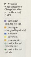 Mapka i legenda z książki ks. Jana Szczepaniaka „Mała ilustrowana historia Kościoła Katolickiego w Polsce", Kraków 2018, s.103. Jednym z ważniejszych inicjatorów Unii był, wspominany już i raczej powszechnie znany, jezuita ksiądz Piotr Skarga. On po podpisaniu aktu, wygłosił na zakończenie „całego synodu kazanie o jedności Kościoła i korzyściach dokonanego połączenia[19]". Kilka lat wcześniej napisał także dzieło pod tytułem: „O jedności Kościoła Bożego pod jednym pasterzem i o greckim od tej jedności odstąpieniu". Dzieło to pochwalał sam kardynał Hozjusz. Ciekawostką jest to, że pierwsze wydanie tej pracy, było dedykowane przez Skargę najpotężniejszemu magnatowi na Rusi, księciu Konstantemu Ostrogskiemu. Książę ten był na początku procesów zjednoczeniowych wielkim i gorliwym zwolennikiem Unii, niestety później, kiedy mimo jego sprzeciwu w sierpniu roku 1595, król zatwierdził projekt Unii, stał się on jej zajadłym wrogiem. Udało mu się wtedy namówić do odstępstwa jeszcze dwóch biskupów prawosławnych, przekonanego do Unii, lwowskiego biskupa Gedeona Bałabana oraz biskupa przemyskiego Michała Kopystyńskiego. Urządzili oni, wraz z Księciem Konstantym Ostrogskim i jego zwolennikami, w tym samym czasie sobór antyunijny. „Rej na nim wodzili: rzekomy wysłannik patriarchatu konstantynopolskiego (...) protosyngiel Nikifor i przedstawiciel patriarchy aleksandryjskiego, krypto-kalwinista [późniejszy patriarcha Konstantynopola, Cyryl] Lukaris. Znaczna więc część społeczeństwa oraz kleru ruskiego i całe dwie diecezje, lwowska i przemyska, pozostały nadal przy [tak zwanej] dyzunii[20]". Wtedy, tych prawosławnych, którzy byli przeciwni Unii nazywano dyzunitami. Młody Janek Kunczyc po przyjeździe do Wilna najczęściej chodził na Msze Święte do cerkwi pod wezwaniem Świętej Trójcy. Był to mocno zubożały i bardzo zaniedbany monaster, czyli klasztor, zamieszkały tylko przez kilku zakonników. Mimo tego, właśnie z tym klasztorem związał się nasz bohater, i w nim był lektorem oraz, będąc obdarzonym wspaniałym głosem, członkiem chóru kościelnego. Tu miał właśnie okazję po raz pierwszy spotkać unitów, bo przełożony klasztoru (czyli archimandryta) Helazji (Gelazjusz) opowiedział się za Unią. Wszyscy zwolennicy schizmy, czyli dyzunici skupili się w wileńskiej cerkwi pod wezwaniem Świętego Ducha, którą wybudowali bratczykowie (tak nazywano świeckich wiernych zrzeszonych w cechach rzemieślniczych, którzy tworzyli bractwo wokół własnych cerkwi) z cerkwi Świętej Trójcy, jeszcze przed przejęciem jej przez unitów. Otrzymali oni jeszcze dodatkowo przywilej Stauropigii, czyli nie byli podporządkowani metropolicie Kijowa, który był unitą tylko podlegali bezpośrednio patriarsze Konstantynopola. I właśnie ci członkowie bractwa, którym nie podobała się Unia przechodzili do tej nowej cerkwi, która została po roku 1611 jedyną prawosławna świątynią w Wilnie. W klasztorze Świętej Trójcy miał też młody Jan okazję poznać przysłanych do Wilna, przez Papieża Klemensa VIII, kapłanów, którzy otrzymali zadanie, aby nauczać unijne duchowieństwo. Byli to Piotr Arkadiusz, grekokatolicki teolog, Hipacy Pociej, pierwszy metropolita unicki, Genadij Chmielnicki, student Seminarium Papieskiego w Wilnie i jednocześnie uczeń Piotra Arkadiusza, Walenty Fabrycy i Grzegorz Grużewski, którzy byli profesorami jezuickimi oraz (Jan imię z chrztu) Józef Welamin Rutski, świeży absolwent kolegium greckiego w Rzymie. Losy Rutskiego są bardzo powiązane z losami Jozafata. Rutski wychował się w rodzinie kalwińskiej, nie lubił prawosławia, do którego bardzo zraził się w młodości. Będąc studentem, najpierw w Pradze a później w Würzburgu, nawrócił się na katolicyzm, ale przy ciągłej niechęci do prawosławia. Następnie kontynuował naukę w Rzymie a po tych studiach, właśnie z polecenia papieża, ku swojej boleści, miał zdobytą wiedzą służyć Cerkwi. Przybył więc do Wilna i tu oddał się do dyspozycji metropolity unickiego Pocieja. Wtedy też poznał się z Janem. „I oto Kuncewicz odmienił owego człowieka bardzo uczonego doktora dwóch fakultetów: Rutski poznawszy Kuncewicza, zobaczył przez niego cały blask i dostojeństwo Cerkwi, o której mniemał pierwej, że obumarła. I był zauroczony. (...) Serdecznie się polubili i zaprzyjaźnili[21]". Takie właśnie znajomości pozwalały młodemu Janowi doskonalić swoją wiedzę i umacniać wiarę. Pewną ciekawostką jest to, że nasz bohater swoją karierę naukową zakończył na powszechnej szkole katedralnej w swoim rodzinnym Włodzimierzu. Później już, nie ukończył żadnego uniwersytetu ani nawet w żadnym kolegium nie rozpoczął nauki. Był natomiast bardzo pilnym i bardzo zdolnym samoukiem. Uważano, że „- był człowiekiem wielkiej inteligencji i umysłu nader sprawnego. Wiele lat później, gdy przyszło mu być władyką połockim - jezuita, ojciec Stanisław Kosiński, człek wysoko wykształcony, i rektor tamtejszego kolegium, który dużo z nim rozmawiał, wielce się dziwował, że na żadnej spornej kwestii Kuncewicza złapać nie było można, aby błądził, albo źle rozumował. A wiedząc, że ów żadnych szkół nie kończył, nazywał go »naturalnym Bożym teologiem«[22] Ale to właśnie pod kierunkiem takich wykształconych osób duchownych i profesorów, założonej przez króla Stefana Batorego Akademii Wileńskiej, „przeszedł »prywatny« kurs filozofii oraz teologii dogmatycznej i moralnej[23]" , a także doskonalił język starosłowiański i liturgię. Warto zwrócić uwagę na to, że przecież w tym samym czasie Jan jeszcze praktykował i pracował u kupca Popowicza. A musiał to robić na tyle dobrze, że ten „postanowił wydać za Jana swoją córkę i oddać mu cały swój majątek i handel[24]". Ale jak mówi stare powiedzenie: „człowiek pl