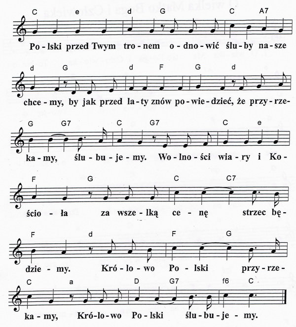 Śluby Jasnogórskie 1. O Wielka Matko Boga i Człowieka, Tobie Ojcowie nasi ślubowali, Twojej opiece los całego Świata Oraz Ojczyzny naszej powierzali. Dziś wielkie hasła wcielać chcemy w życie, By nie złamane było dane słowo, Chcemy wypełniać wszystkie przyrzeczenia, W Twoją opiekę oddać się na nowo. Ref: Królowo Polski przed Twym tronem Odnowić śluby nasze chcemy. By jak przed laty znów powiedzieć, Że przyrzekamy, ślubujemy: Wolności wiary i Kościoła za wszelką cenę strzec będziemy. Królowo Polski - przyrzekamy, Królowo Polski - ślubujemy. 2. Będziemy bronić każdej polskiej duszy, By daru łaski nigdy nie straciła. Będziemy czuwać, by kołyska polska Smutkiem i pustką nigdy nie świeciła. Będziemy strzec ogniska domowego, Lecz Ty nam pomóż Pani i Królowo. Pomóż wypełnić wszystkie przyrzeczenia, W swoją opiekę przyjmij nas na nowo. 3. Przy Twoim boku chcemy, o Maryjo Walczyć z wadami Polskiego Narodu. Aby pod każdym dachem, każdą strzechą Nie było płaczu i nie było głodu. Chcemy żyć zawsze w zgodzie i w pokoju. Chcemy, by miłość wokół panowała. Chcemy Maryjo, aby Polska cała W Twoją opiekę dzisiaj się oddała.